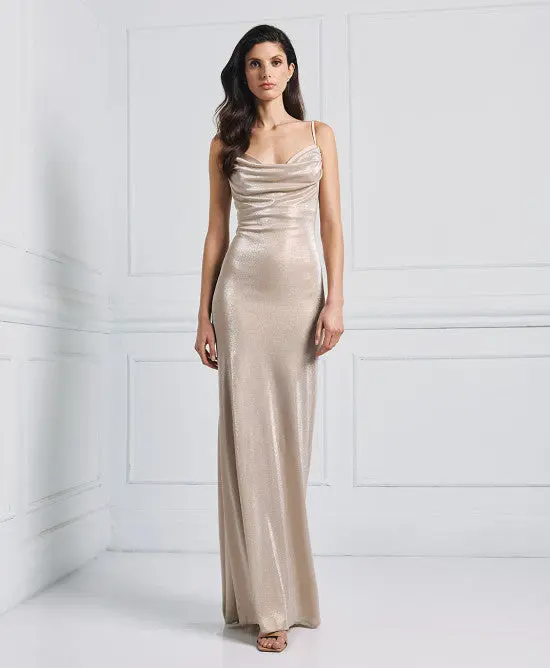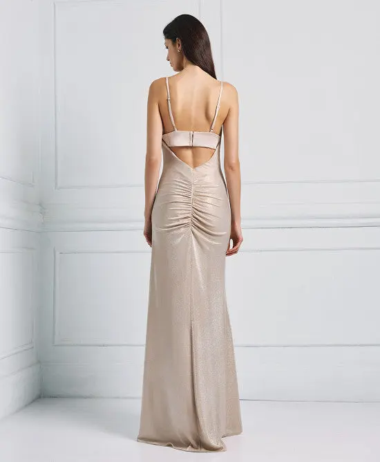 Abito lungo effetto metallizzato con dettagli drappeggiati sul davanti e arricciatura sulla schiena. Presenta spalline sottili e una schiena scoperta. Vestibilitร regolare. Tessuto leggermente elastico. Top bustier in raso. Ritaglio sul retro. Chiusura con cerniera nascosta e gancio sul retro. ร una scelta elegante per le occasioni piรน eleganti.