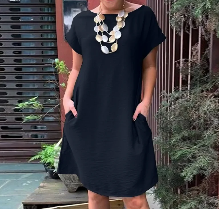 Vuoi comfort senza rinunciare allo stile? Questo abito largo con scollo rotondo e maniche corte รจ il tuo alleato perfetto per un look rilassato ma raffinato. Ideale per un brunch, fare commissioni o rilassarsi a casa, ti offre comoditร tutto il giorno con un tocco casual e affascinante. Semplice, moderno e sempre di tendenza.