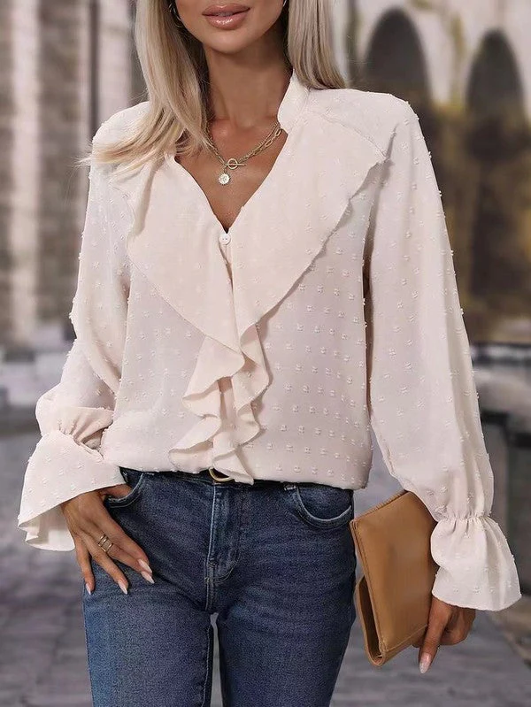 Anika – Elegante blusa a maniche lunghe con scollo a V e volant in plumetis