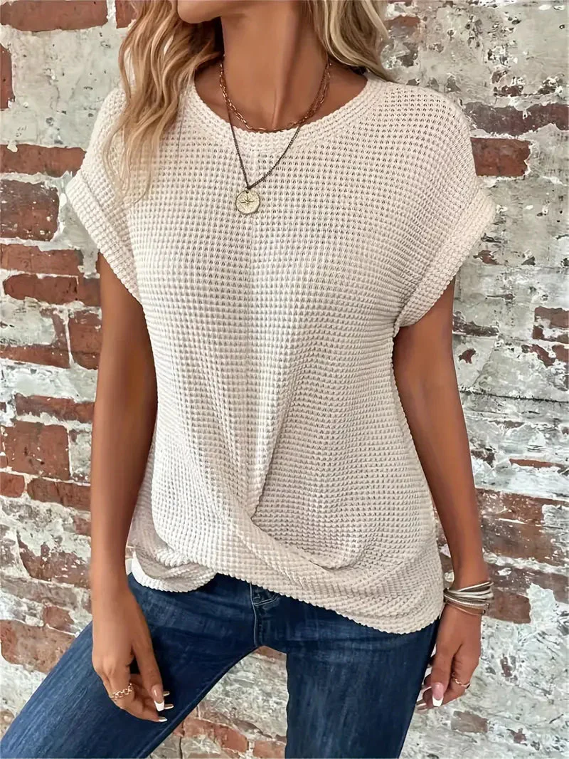 Realizzata in un tessuto di maglia morbido e di alta qualitร , questa maglietta offre una vestibilitร rilassata senza rinunciare allo stile. La trama waffle non solo aggiunge un dettaglio di design sottile, ma migliora anche la traspirabilitร , rendendola perfetta per ogni stagione. La sua costruzione resistente garantisce che manterrร forma e morbidezza dopo ogni lavaggio, mentre il collo rotondo e la silhouette classica le conferiscono un fascino intramontabile.