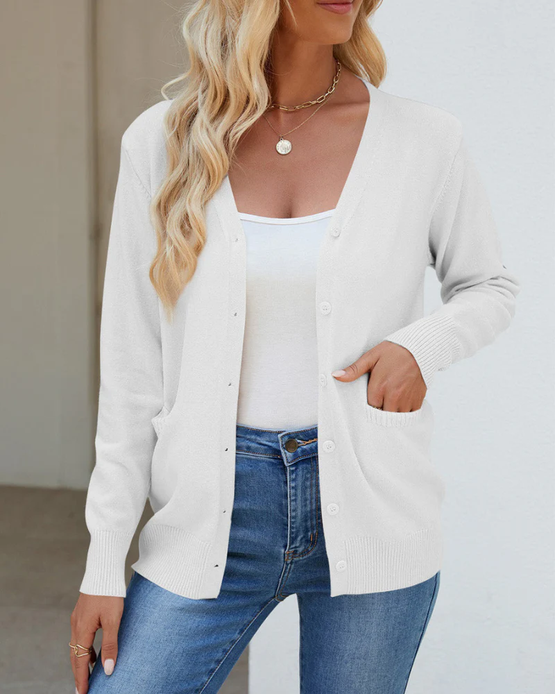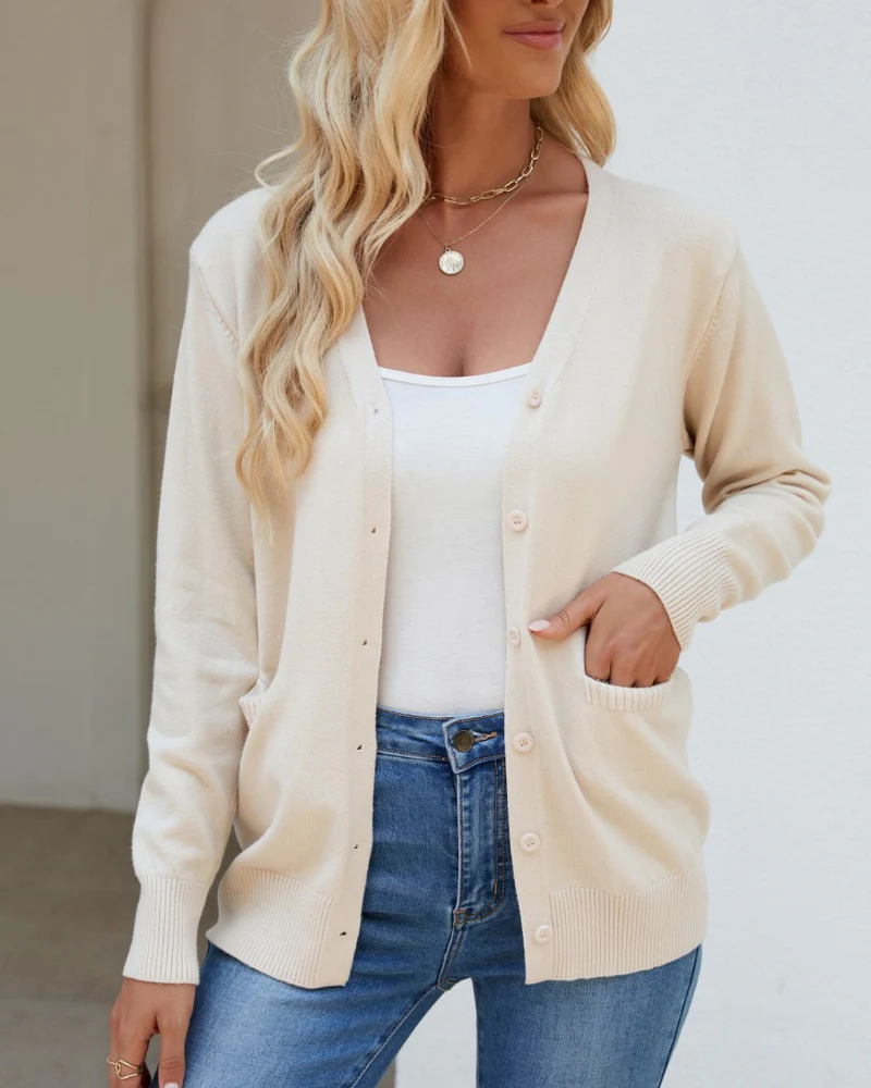 Hai bisogno di un capo che unisca stile e funzionalitร ? Questo cardigan con scollo a V e bottoni รจ la scelta perfetta. Grazie alle maniche lunghe, alle tasche funzionali e al suo design classico, ti regala calore e versatilitร per ogni giornata. Ideale per momenti casual o incontri con stile.