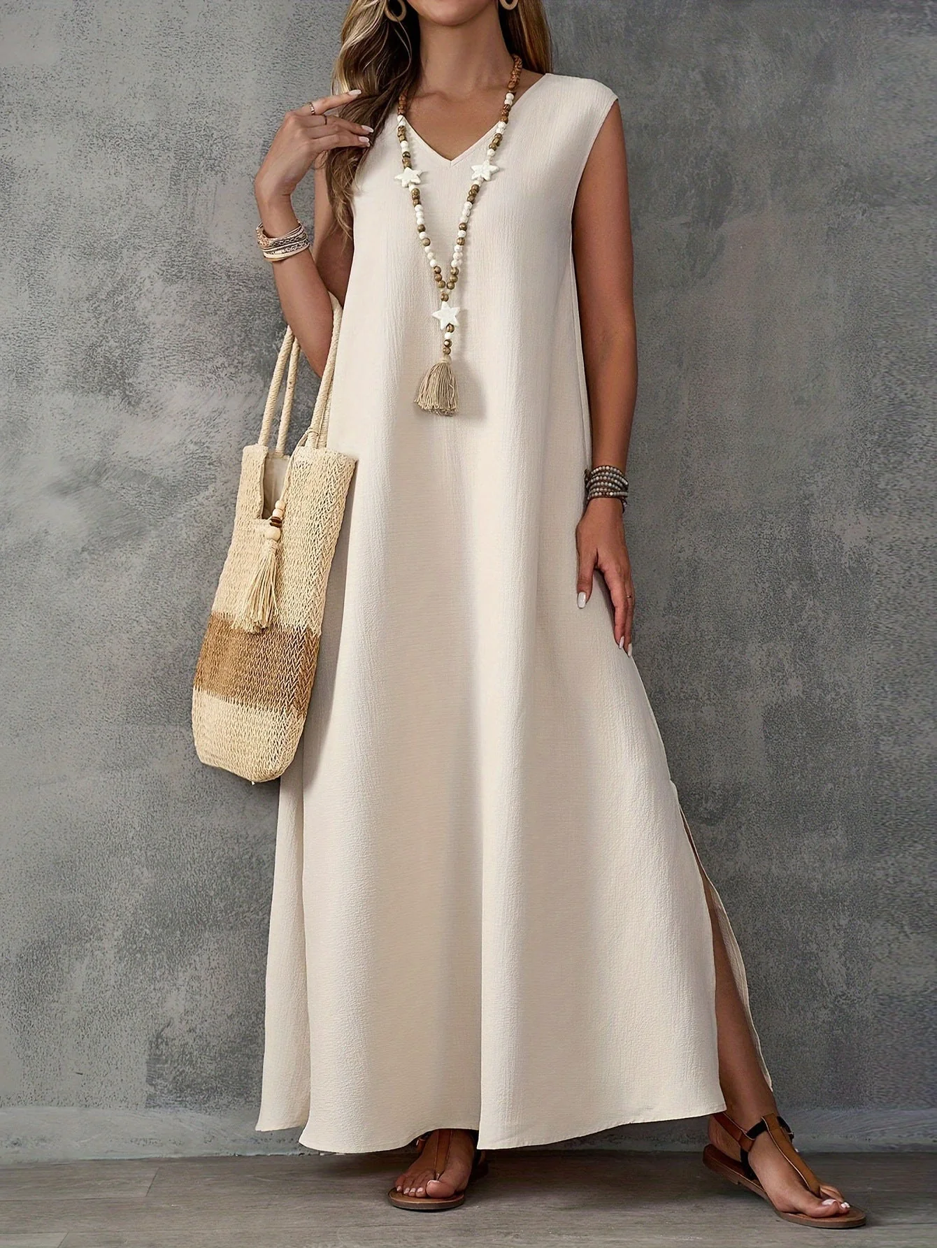 Cerchi un abito che unisca stile rilassato e comoditร totale? Questo abito lungo senza maniche con scollatura a V รจ il perfetto equilibrio tra eleganza senza tempo e comfort quotidiano. La silhouette fluida e lo scollo valorizzante si adattano a ogni tipo di corpo, ideale per passeggiate, pranzi o vacanze al mare.