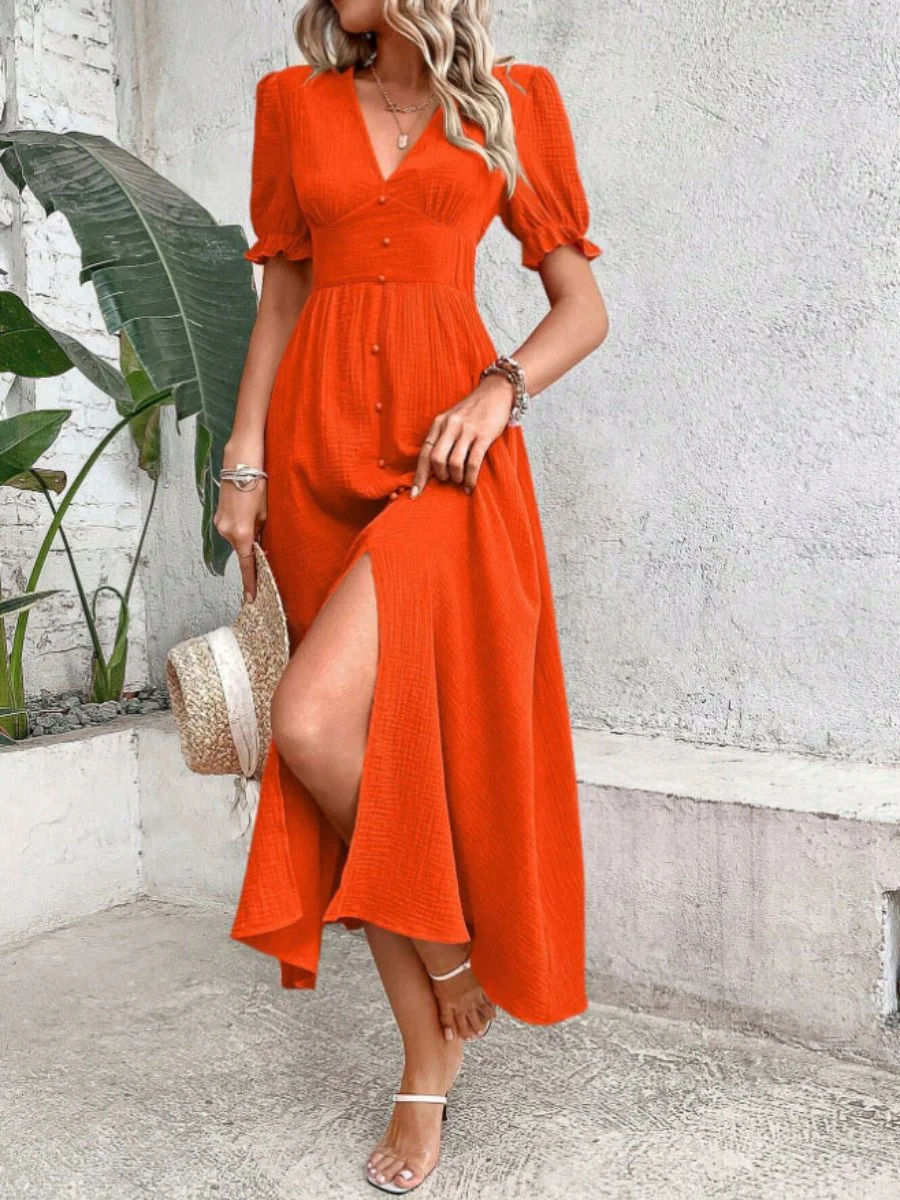 Realizzato in tessuto morbido e di alta qualitร , questo abito dona una sensazione lussuosa e una caduta impeccabile. Lo scollo a V profondo aggiunge un tocco di sofisticazione, mentre le maniche corte con volant creano un dettaglio femminile e delicato. La forma a linea A valorizza ogni tipo di corpo, offrendo un movimento elegante e armonioso. Perfetto per matrimoni, cene o eventi chic, รจ un capo essenziale nel tuo guardaroba.