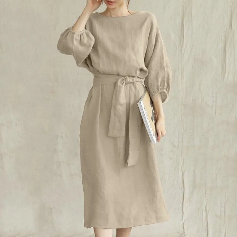 Abito a turni con scollo a pallina e vita annodata sul retro