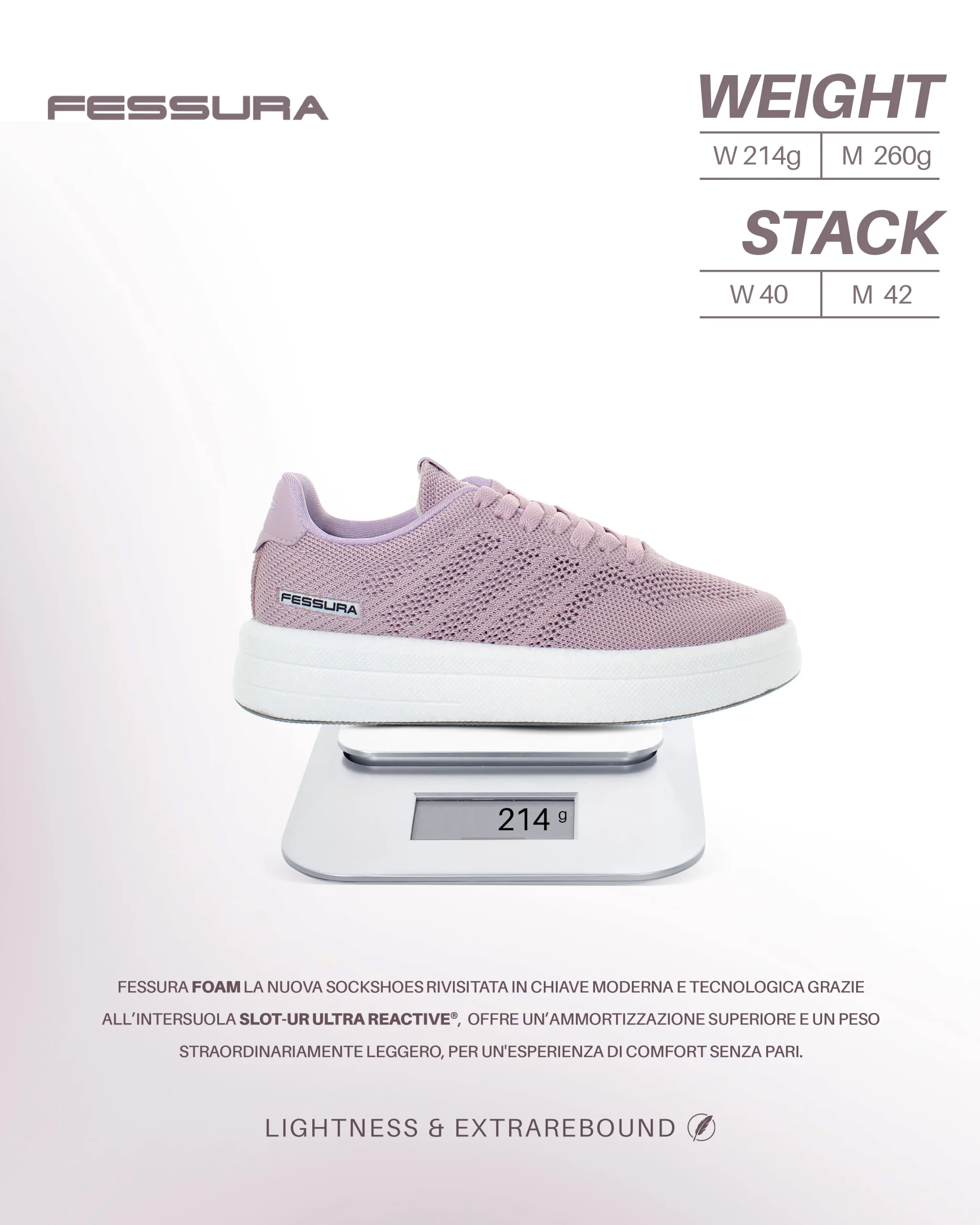 La sneaker FOAM K, nella colorazione must have tutta bianca, รจ una novitร della collezione Fessura. Si presenta con una tomaia realizzata in flyknit, traspirante e leggera, che dona grande freschezza e un’allacciatura frontale con lacci in tinta. Soletta interna estraibile. Il battistrada in gomma con il logo garantisce un grip ideale su ogni terreno. ร una sneaker leggerissima, pesa poco piรน di 200 grammi.