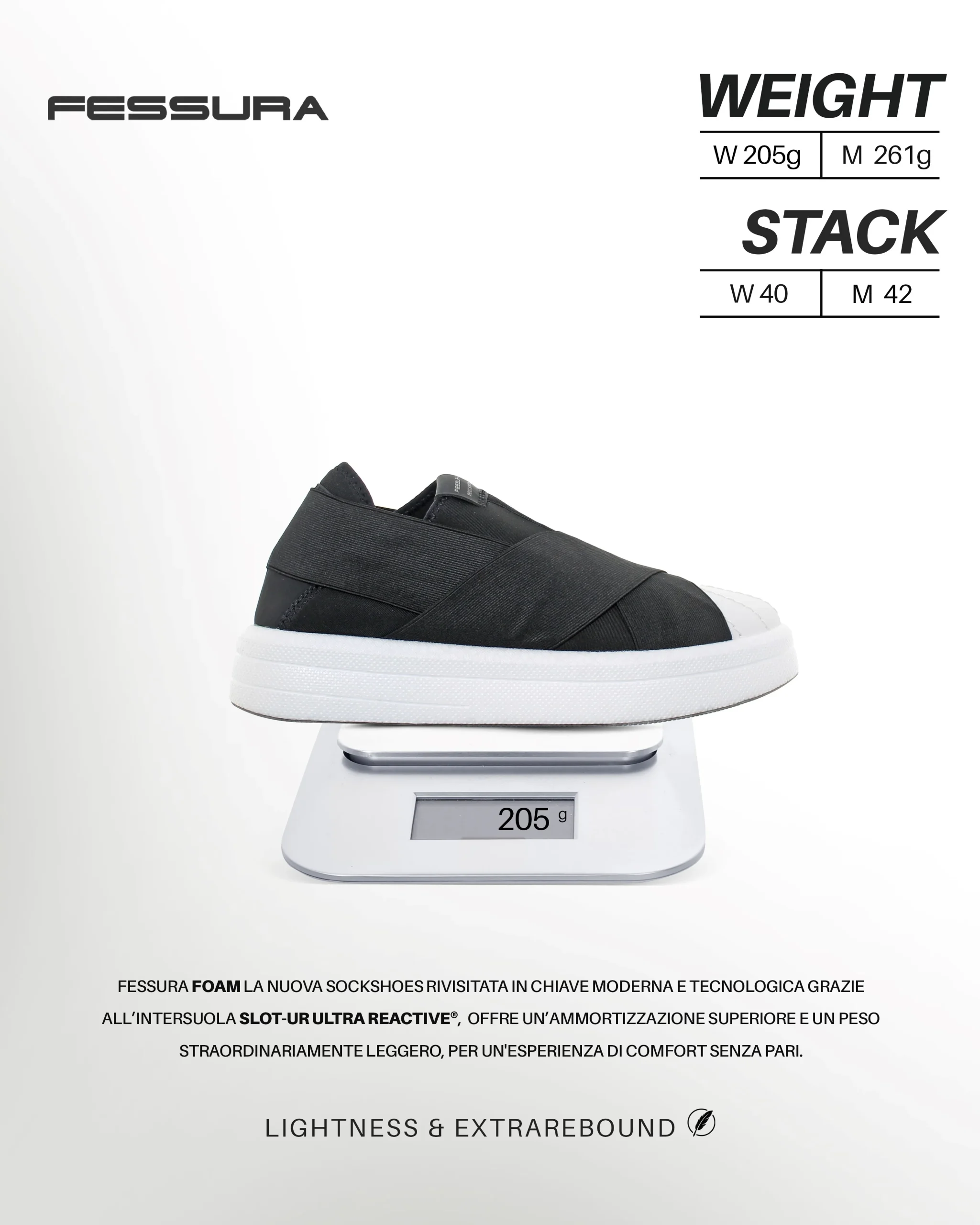 La sock shoe FOAM X, nera con fondo bianco, si presenta con una tomaia realizzata in flyknit, traspirante e leggera, che dona grande freschezza. Le fasce elastiche brevettate sono le icone Fessura. Soletta interna estraibile. Il battistrada in gomma con il logo garantisce un grip ideale su ogni terreno. ร una sneaker leggerissima, pesa poco piรน di 200 grammi.