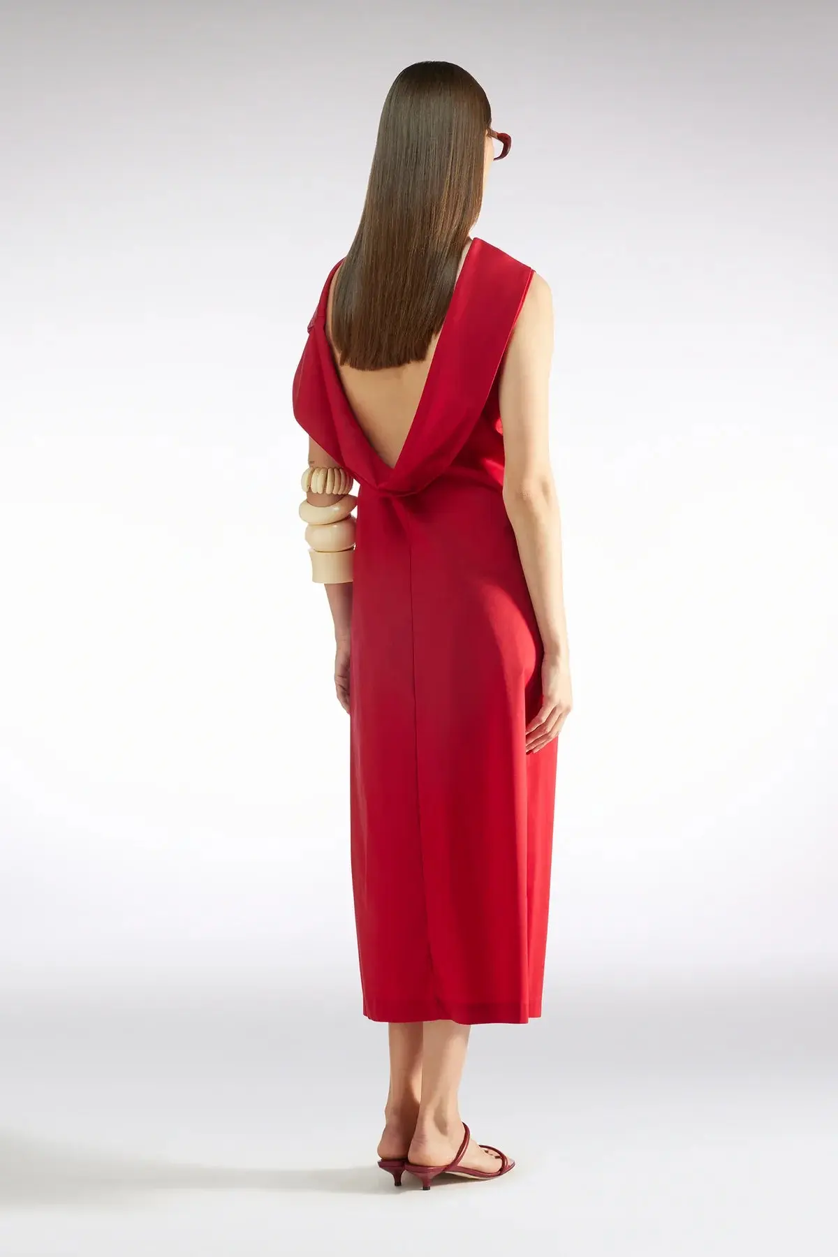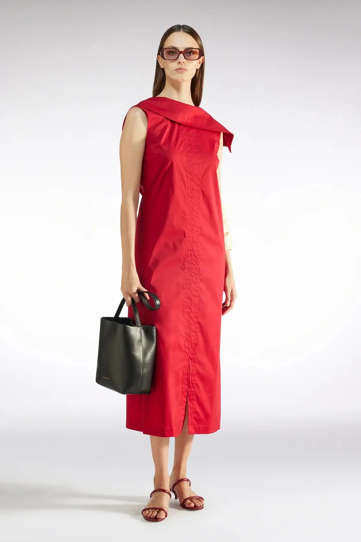 Effetto sorpresa per questo abito midi in cotone. Spacco centrale. Colletto a punta su di un lato e profonda scollatura dietro. Smanicato. Linea dritta e dettaglio di impunture sul davanti. Abbinalo a bracciali color oro e sandali gioiello per illuminare le tue serate estive.
