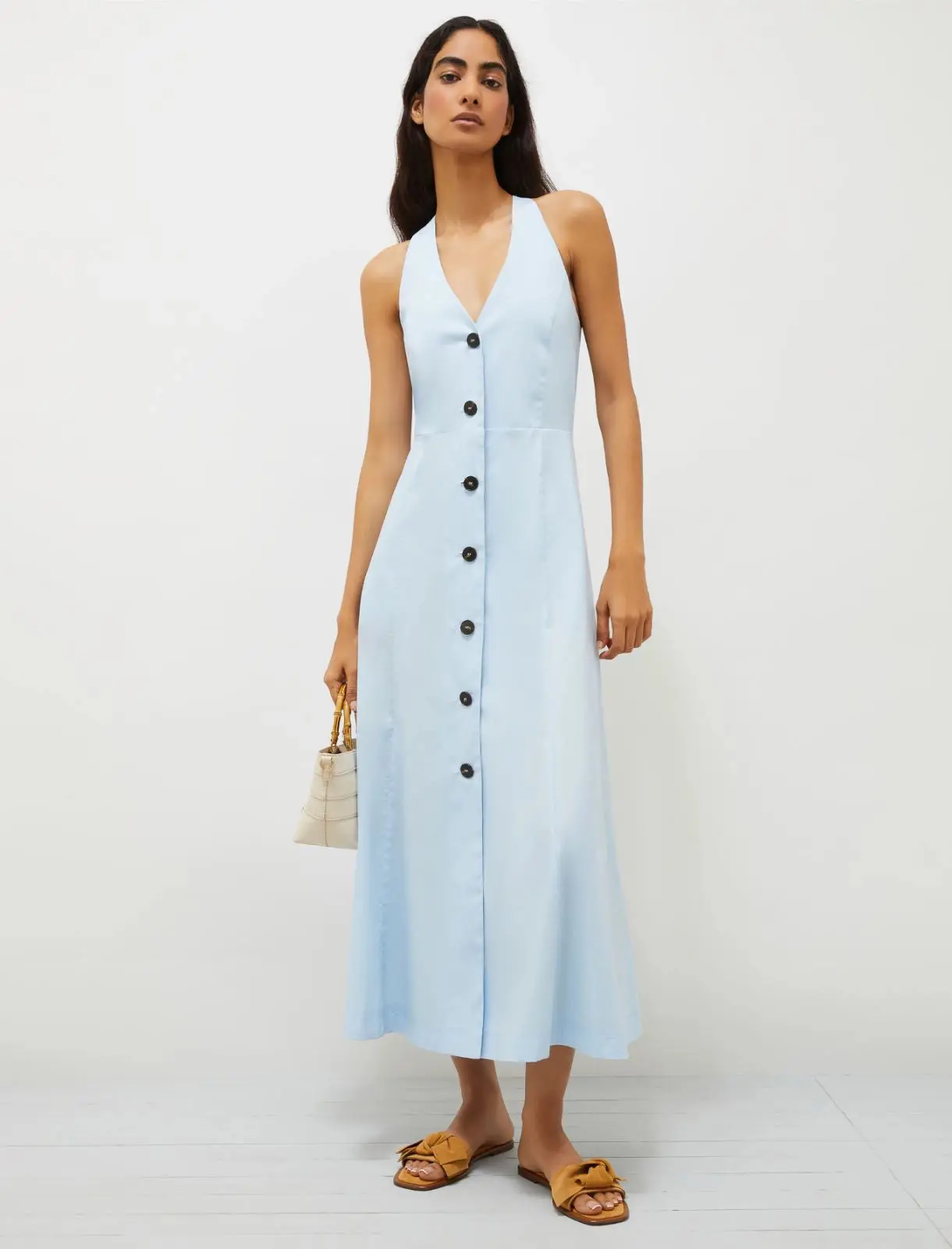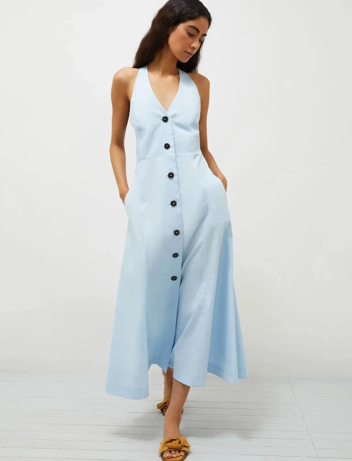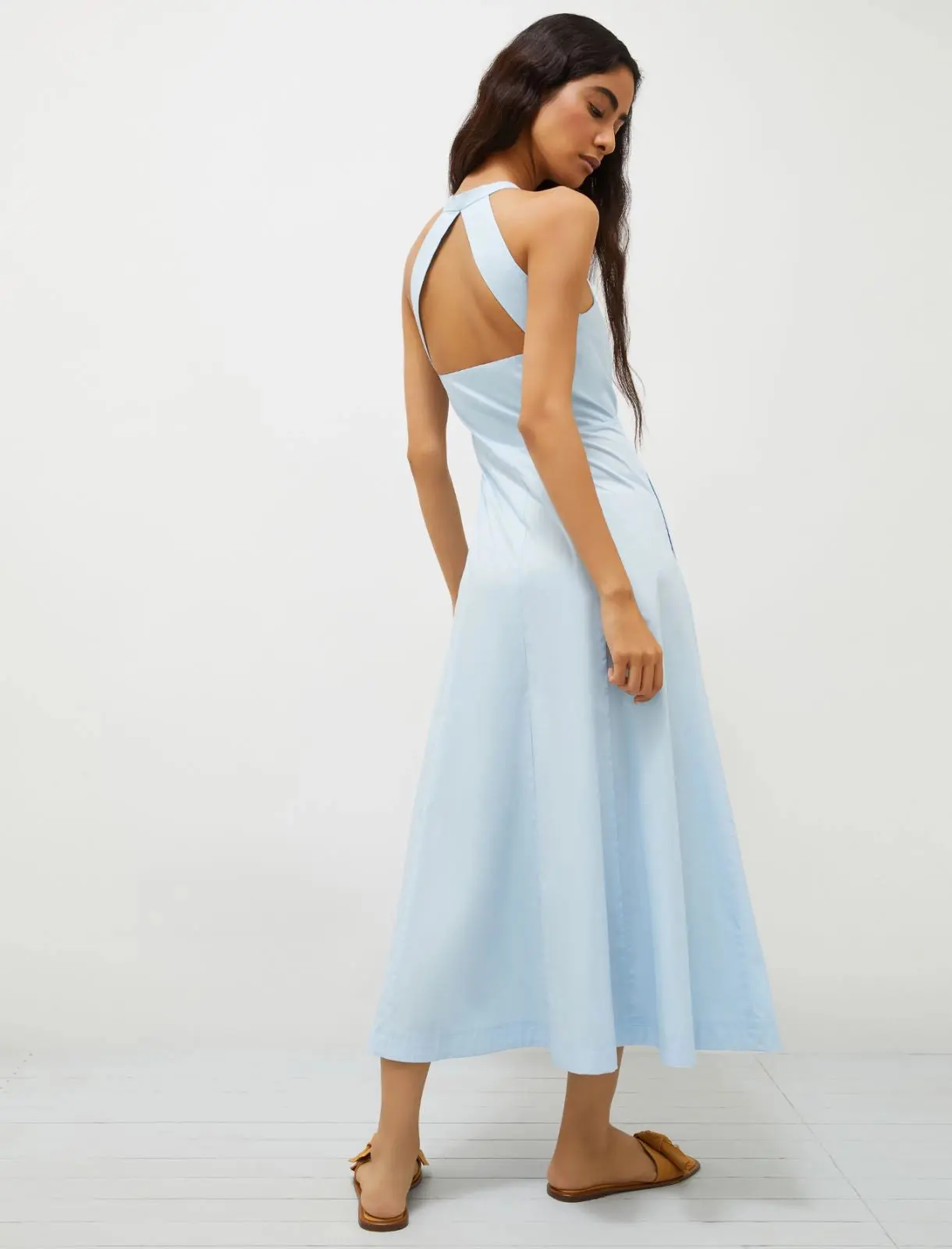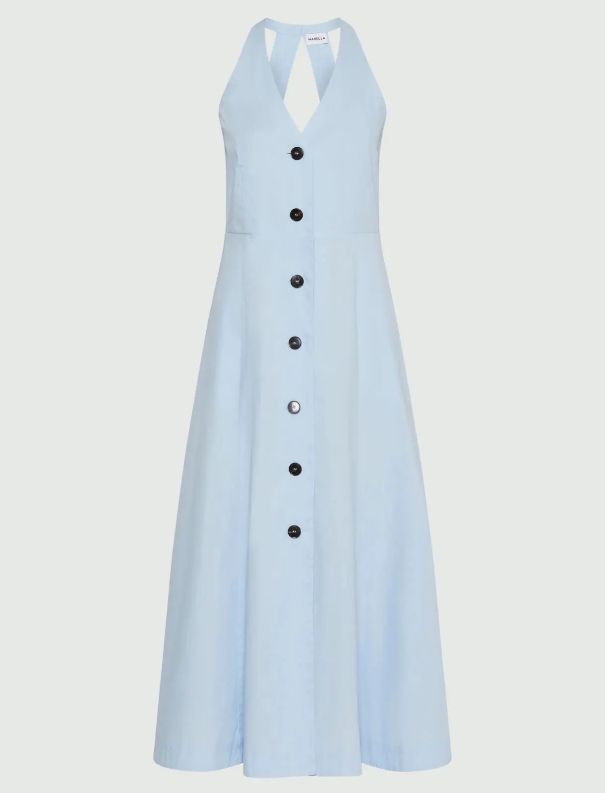 L’eleganza intramontabile dello chemisier, in versione contemporanea: nuovo abito smanicato in popeline leggero, con silhouette disegnata sul busto e un gioco di contrasti tra tessuto e abbottonatura. Abito in popeline di cotone stretch dalla linea aderente sul bustino con gonna svasata. Scollo all’americana con oblรฒ triangolare sulla schiena. Chiusura con bottoni a vista. Taglio in vita e gonna ampia.
