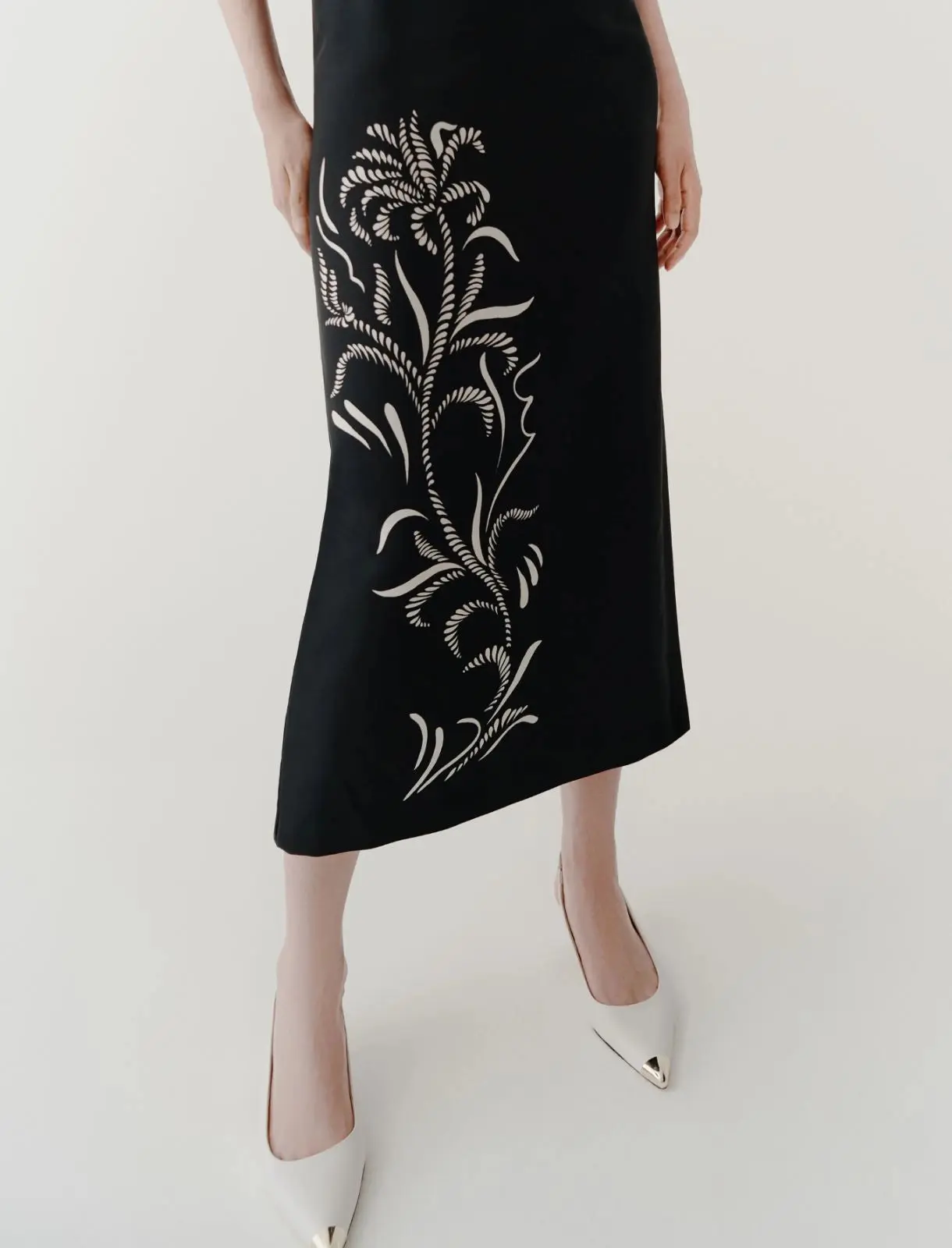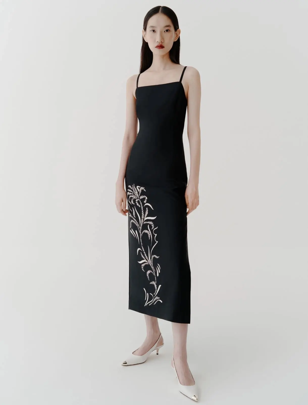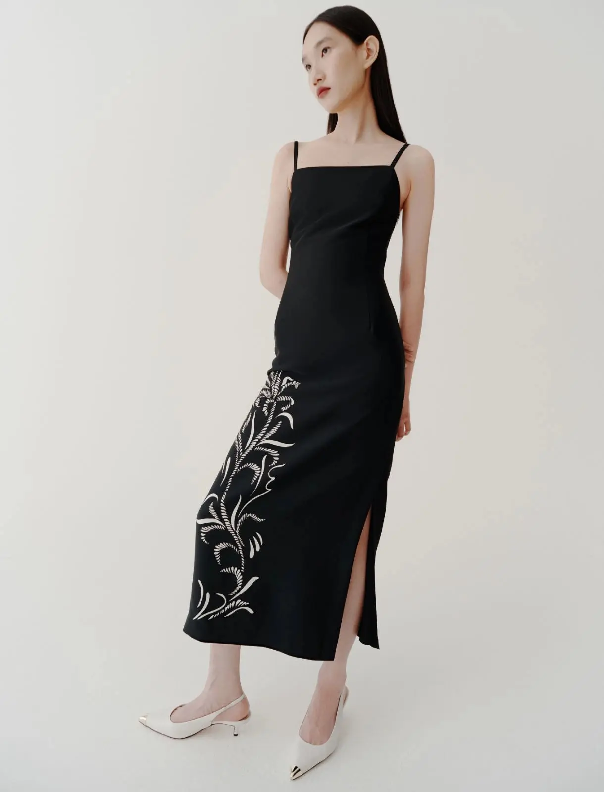 Metti in evidenza la silhouette con questo abito in satin reso speciale dalla stampa foliage sul davanti. Le spalline sottili aggiungono sensualitร al dรฉcolletรฉ. Abito in satin. Fit aderente. Scollo dritto con spalline. Motivo di stampa piazzata sul davanti. Spacco sul fianco sinistro.