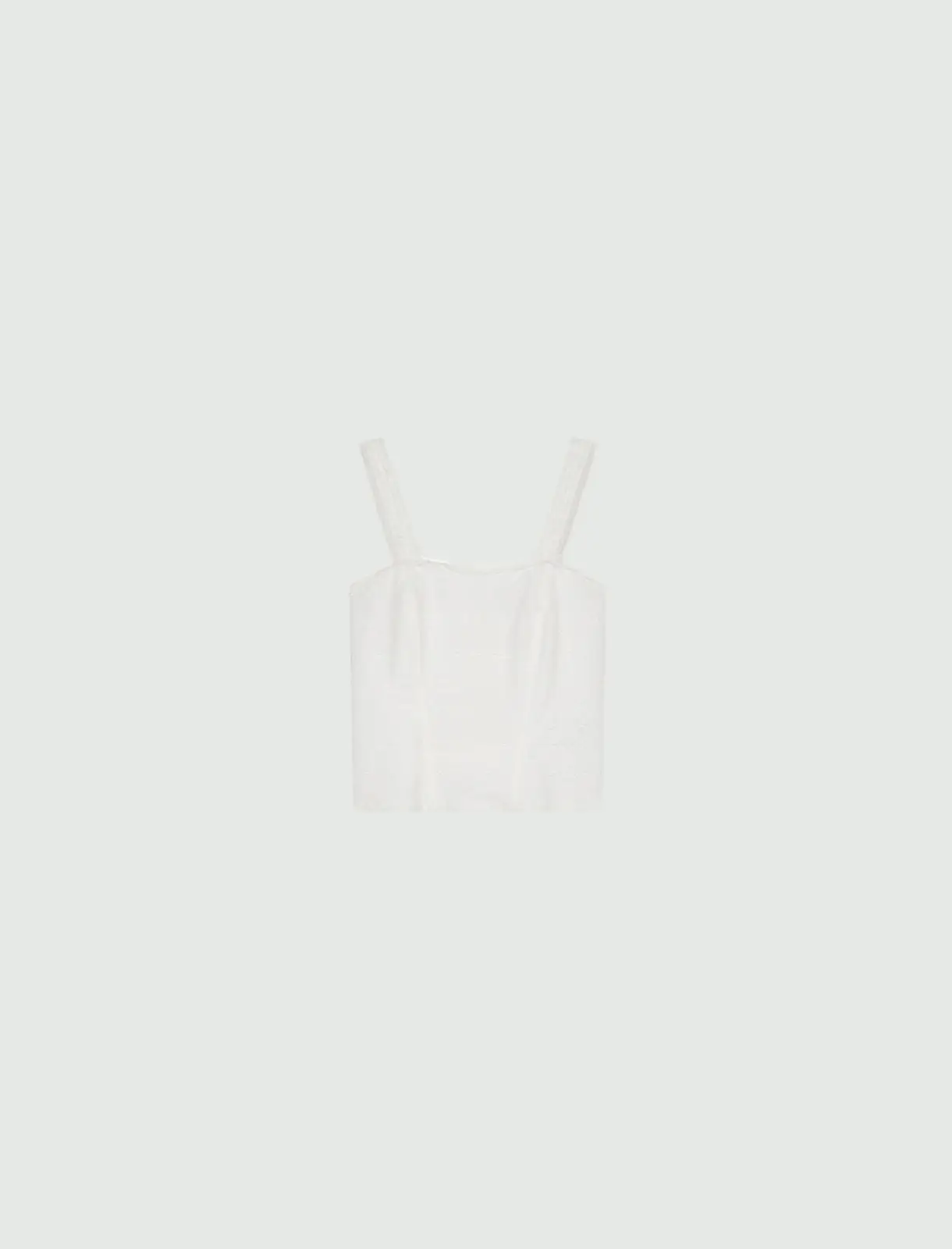 Un grande classico dell’eleganza estiva, il top a bustier viene proposto in voile di cotone con un raffinato ricamo all over. Vestibilitร aderente. Scollo dritto con costruzione a bustier. Chiusura con cerniera. Stecche interne e tagli che disegnano la figura. Dettagli di sfrangiature corte su scollo e spalline.
