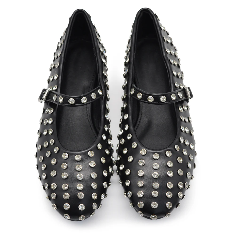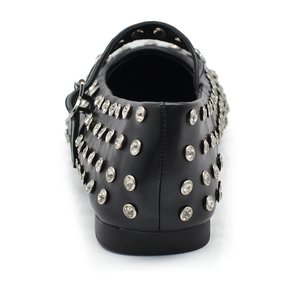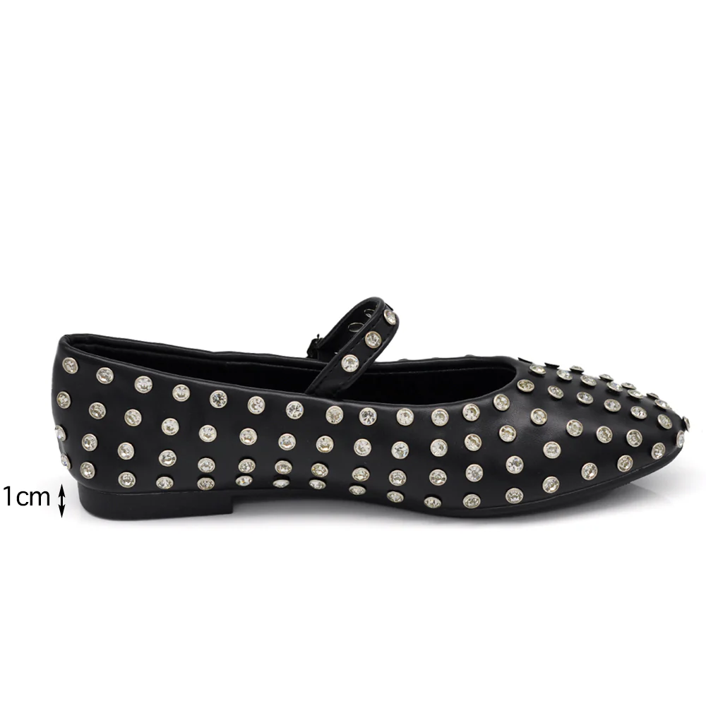 Mary Jane Ballerine con Cinturino Borchie e Strass Brillantini Punta Tonda in Pelle H90