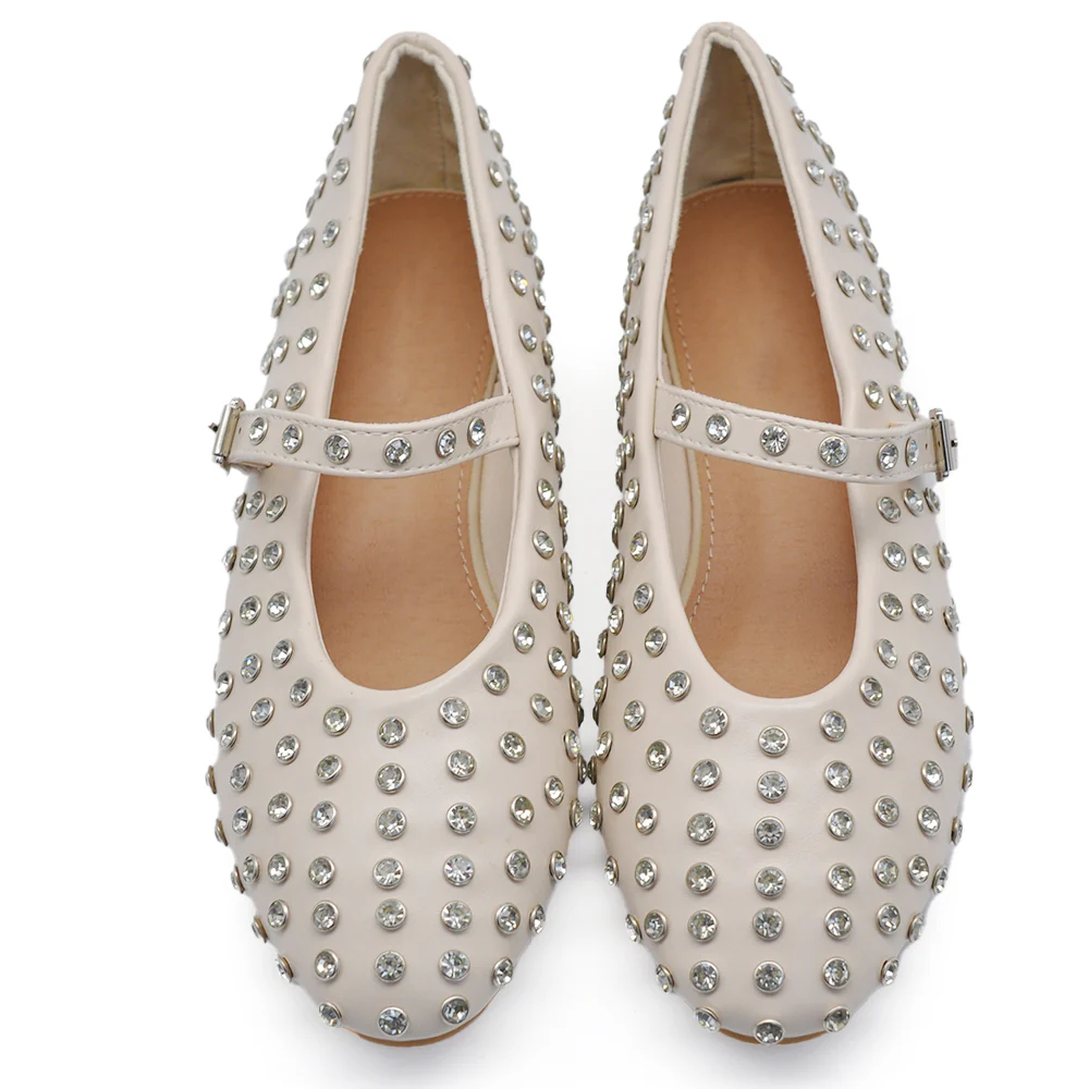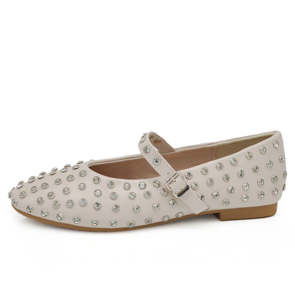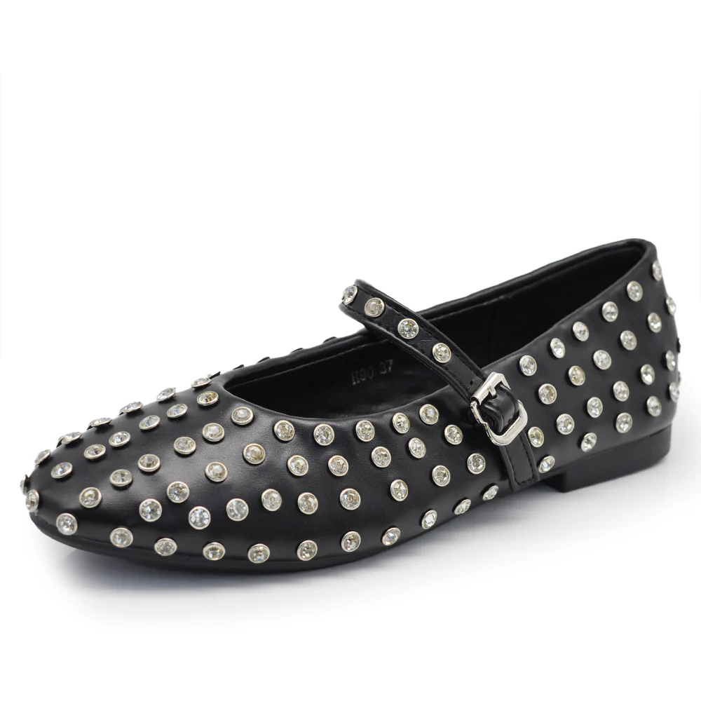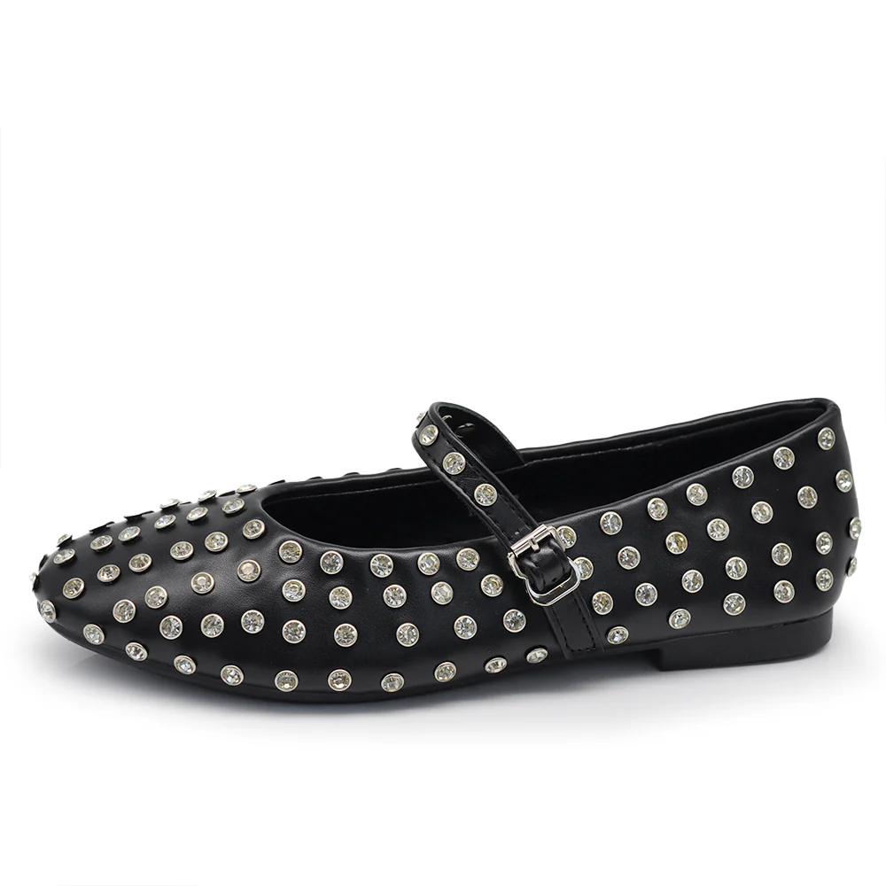 Mary Jane Ballerine con Cinturino Borchie e Strass Brillantini Punta Tonda in Pelle H90