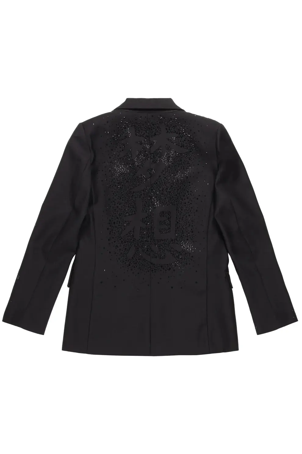 Giacca in fresco lana dal taglio sartoriale, impreziosita da strass applicati per formare scritte e decorazioni. Linea moderna e raffinata, ideale per look sofisticati con un tocco glamour. Versatile e distintiva, ideale per distinguersi in ogni occasione con stile deciso e originale.