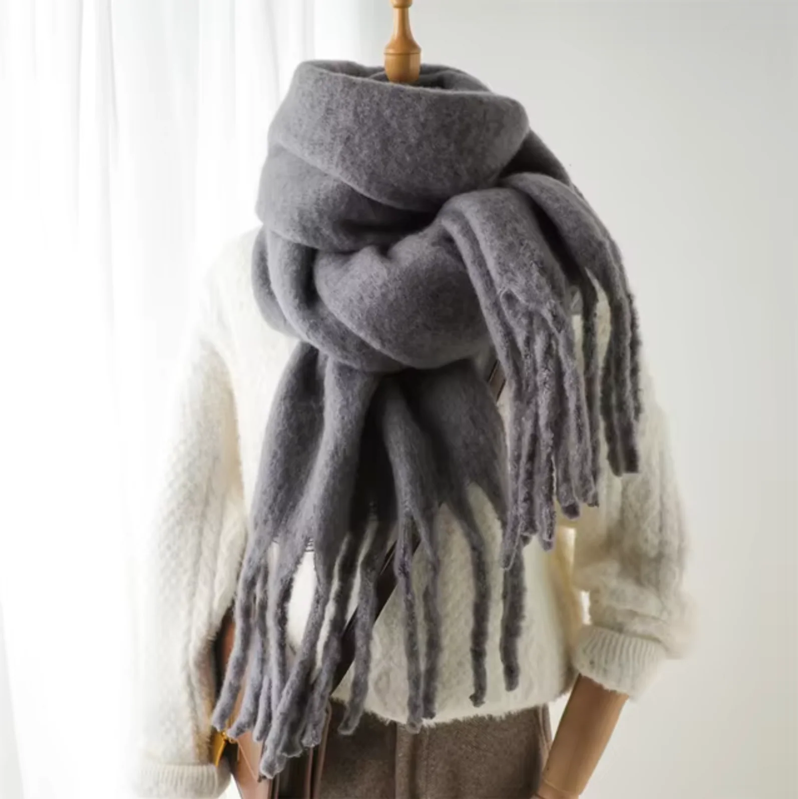 Realizzata in materiale pregiato simile al cashmere, questa sciarpa invernale offre un calore e una morbidezza eccezionali per le giornate fredde. Il design spesso e semplice della pashmina funge da coperta, mentre le lunghe nappe aggiungono un tocco di eleganza.