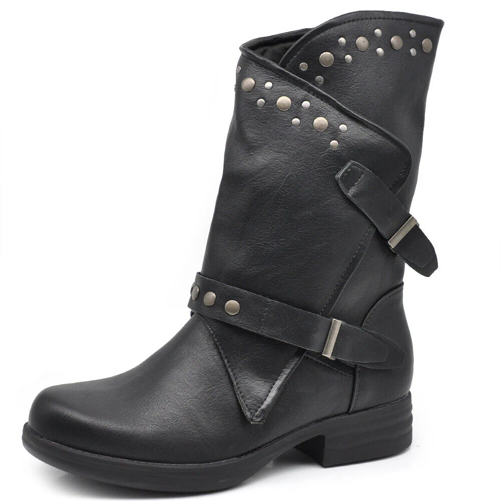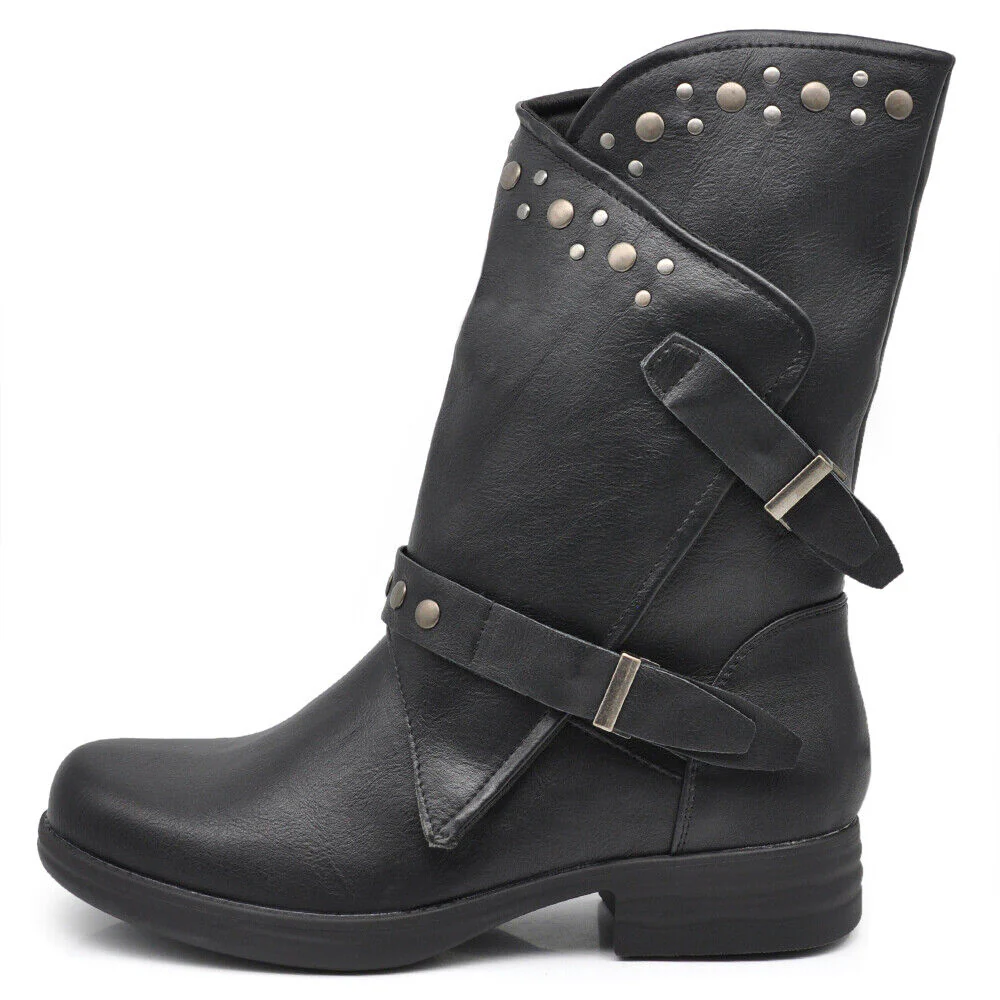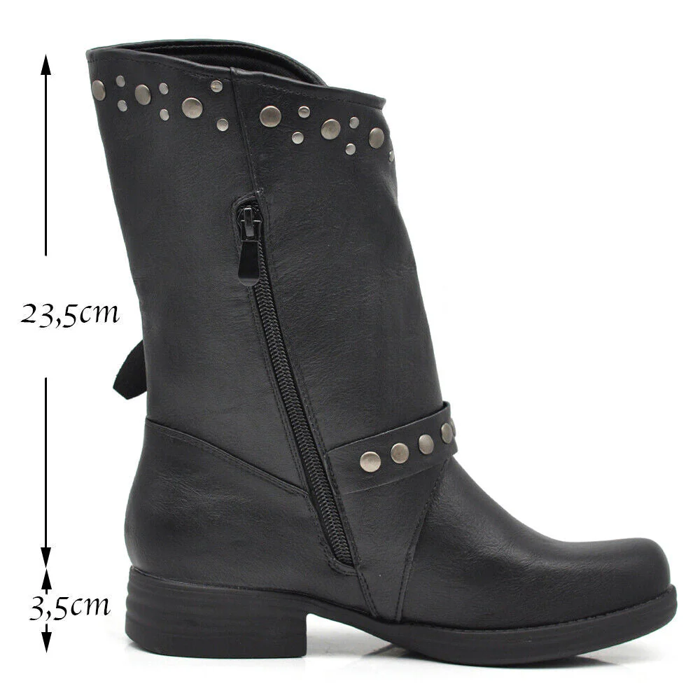 Stivaletti Biker Motociclista Da Donna Polpaccio Largo Con Fibbie Borchie MP647-2 nero marrone testa di moro