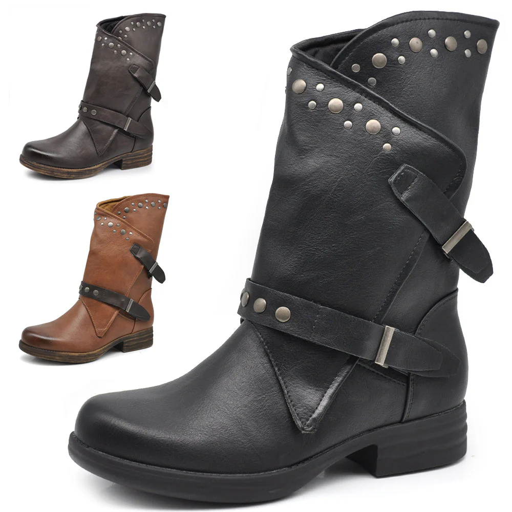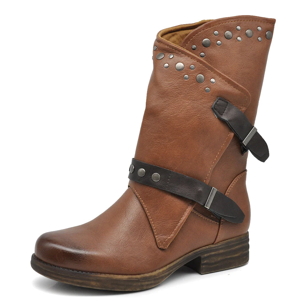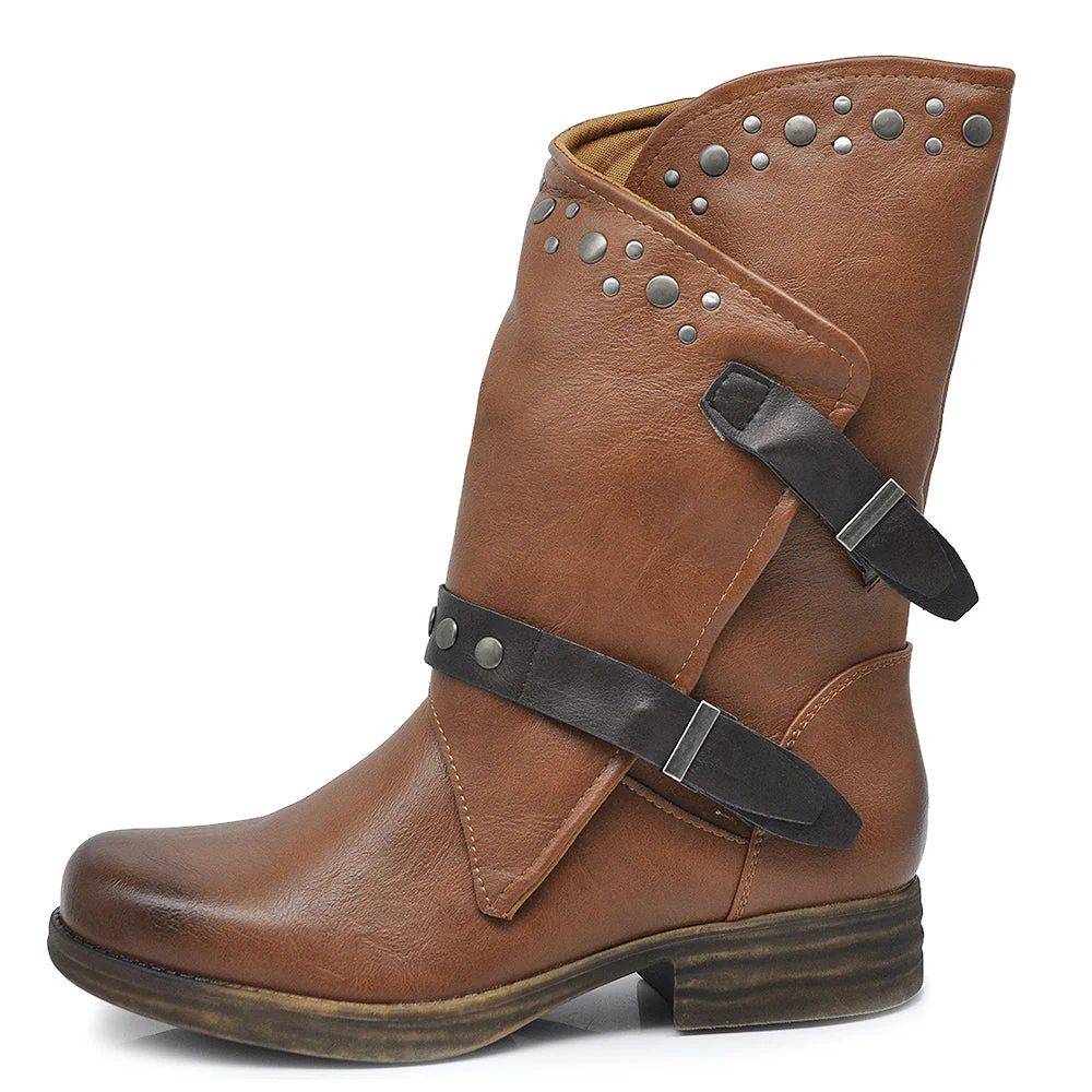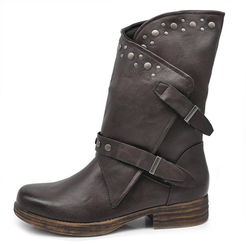 Stivaletti Biker Motociclista Da Donna Polpaccio Largo Con Fibbie Borchie MP647-2 nero marrone testa di moro