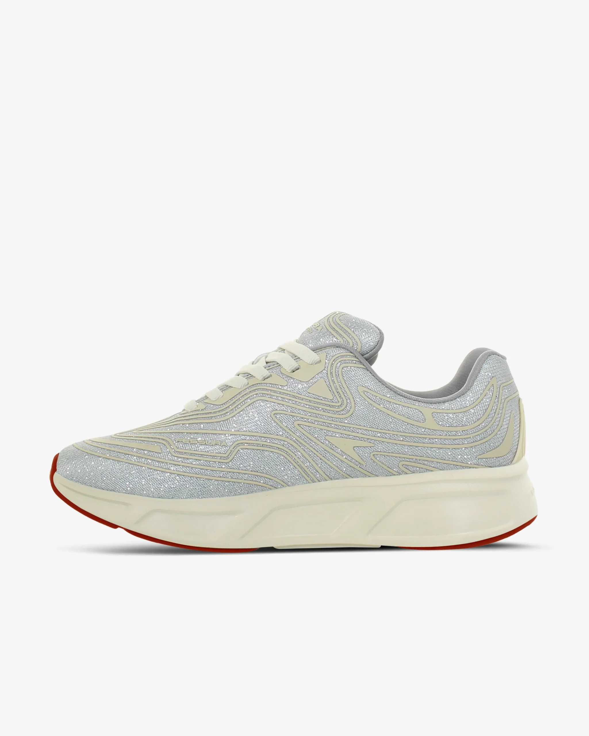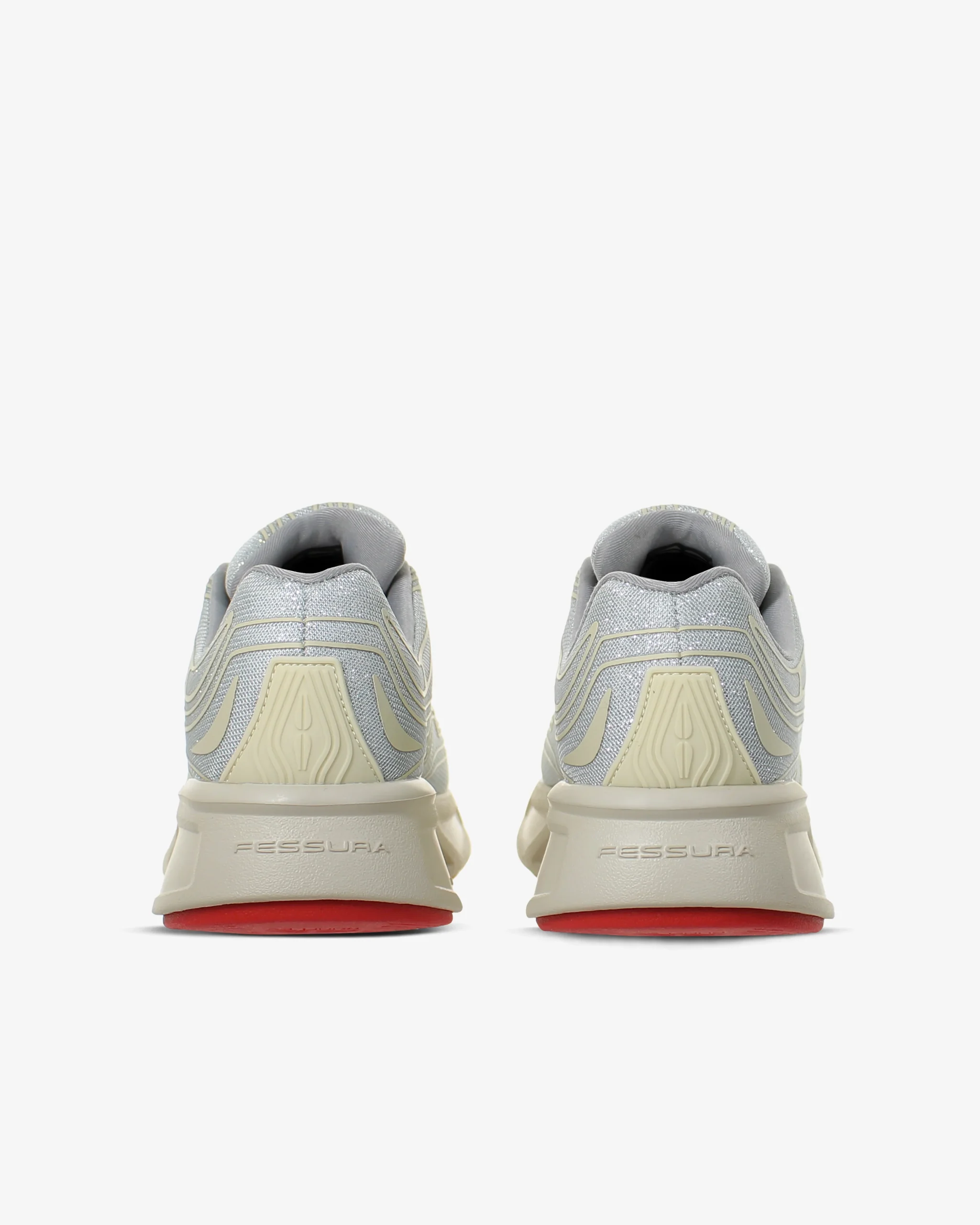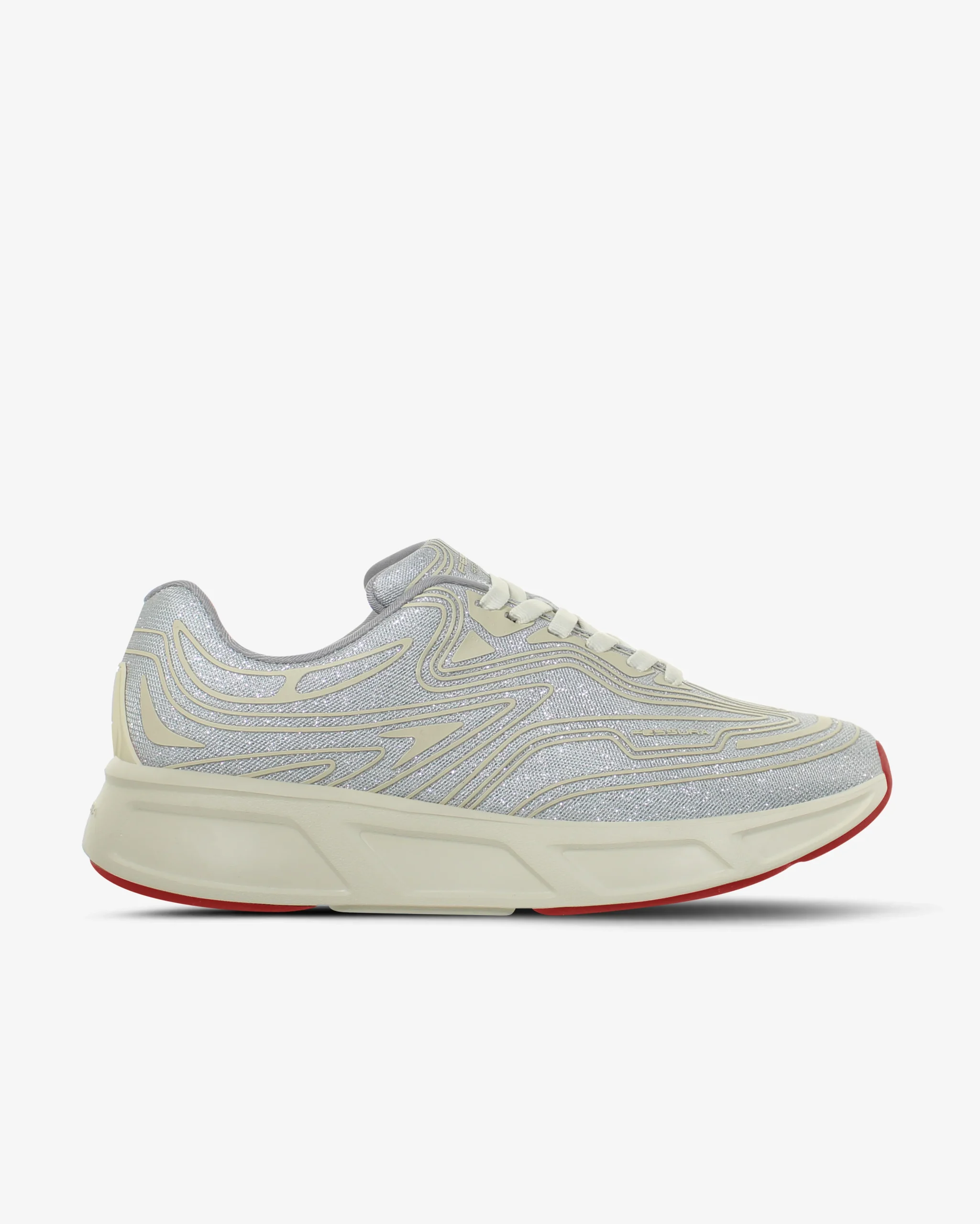 La sneaker WALK #01, nella nuova combinazione in glitter e argento con inserti rossi sulla suola, si presenta con una tomaia realizzata in tessuto traspirante, texture gommata a rilevo 3D, soletta interna estraibile, dettaglio gommato sul tallone e suola in Eva con dettagli in gomma bicolore. รˆ una sneaker flessibile, morbida e leggera per la corsa ed il tempo libero.